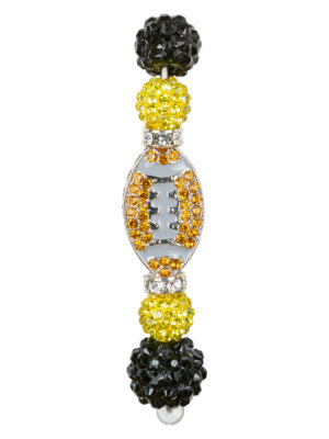 A caramel colored rhinestone football surrounded by wooden, crystal, and rhinestone beads.