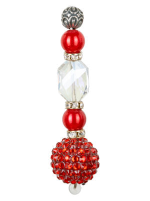Red disco ball bead alongside red metallic pearls, silver, rhinestones, and a crystal center.